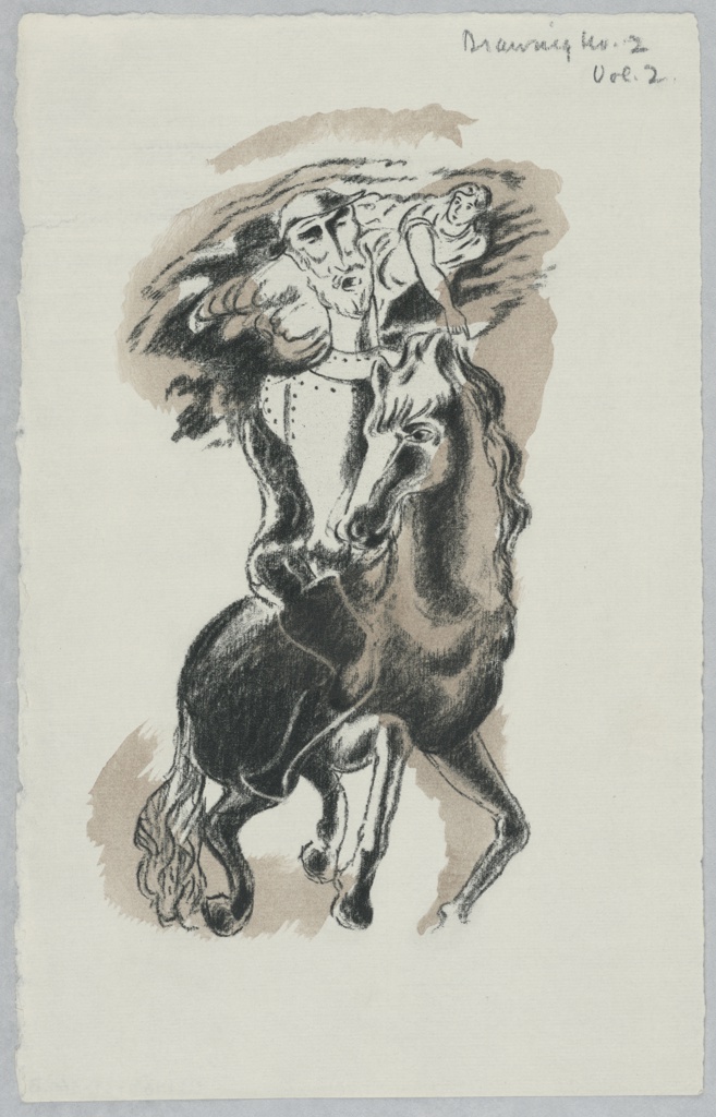 Print, Illustration for Don Quixote; Written by Miguel de Cervantes (Spanish, 1547–1616); Designed by Edward McKnight Kauffer (American, active England, 1890–1954); Printed by The Curwen Press (United Kingdom); Published by Nonesuch Press; USA; offset lithograph, hand-colored additions in brush and brown watercolor on paper; 22.9 × 14.2 cm (9 × 5 9/16 in.); Gift of Mrs. E. McKnight Kauffer; 1963-39-360-b