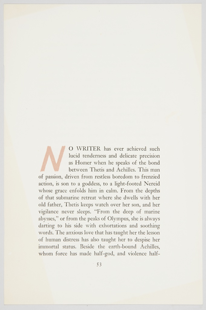 Print, Sample Page of On The Iliad; Designed by Edward McKnight Kauffer (American, active England, 1890–1954); Written by Simone Weil (French, 1909–1943), Rachel Bespaloff (Ukrainian, b. Bulgaria, 1895–1949), Mary Therese McCarthy (American, 1912–1989); Published by Pantheon (United States); USA; lithograph on paper; 22.9 × 14.9 cm (9 × 5 7/8 in.); Gift of Mrs. E. McKnight Kauffer; 1963-39-494-c