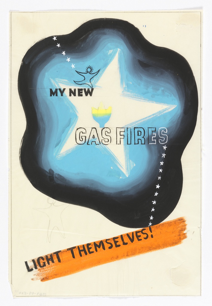 This is a Drawing. It was designed by Edward McKnight Kauffer and made for (as the client) Gas Light and Coke Company. It is dated ca. 1935 and we acquired it in 1963. Its medium is graphite, brush and gouache on tracing paper. It is a part of the Drawings, Prints, and Graphic Design department.