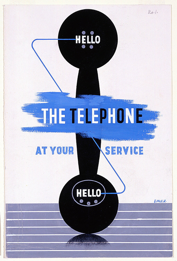 Drawing, Design for "The Telephone at Your Service"; Designed by Edward McKnight Kauffer (American, active England, 1890–1954); Client: British General Post Office; England; brush and gouache, graphite on paper; 26.6 × 17.8 cm (10 1/2 × 7 in.); Gift of Mrs. E. McKnight Kauffer; 1963-39-524