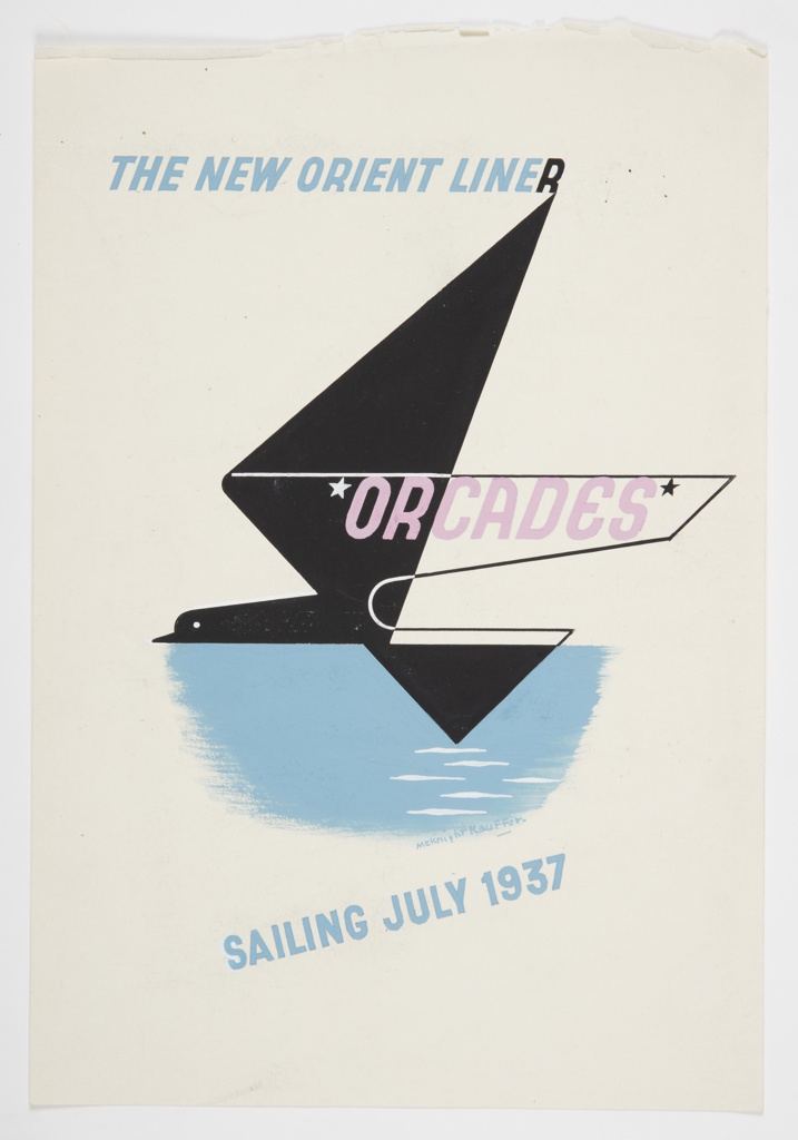 This is a Drawing. It was designed by Edward McKnight Kauffer and made for (as the client) Orient Line, Anderson, Green & Company Ltd.. It is dated March 25, 1937 and we acquired it in 1963. Its medium is brush and blue, black, and pink gouache on heavy paper.. It is a part of the Drawings, Prints, and Graphic Design department.
