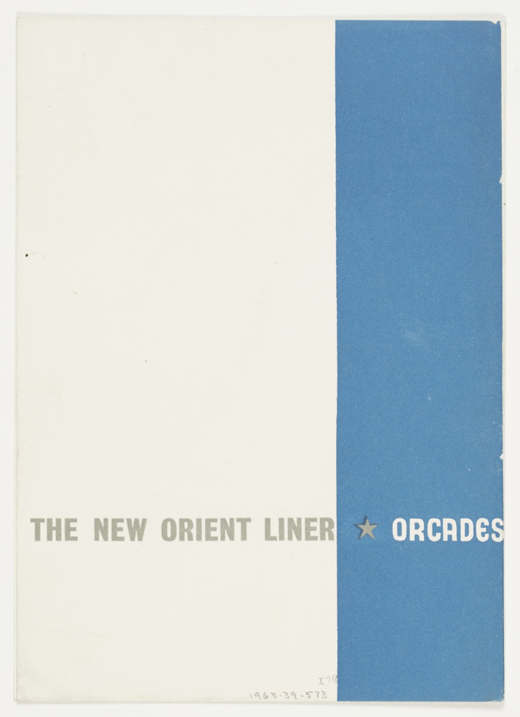 Brochure, Orcades, Description and Technical Details; Designed by Edward McKnight Kauffer (American, active England, 1890–1954); Client: Orient Line, Anderson, Green & Company Ltd.; USA; offset lithograph on paper; 18.7 × 13.4 cm (7 3/8 × 5 1/4 in.); Gift of Mrs. E. McKnight Kauffer; 1963-39-573