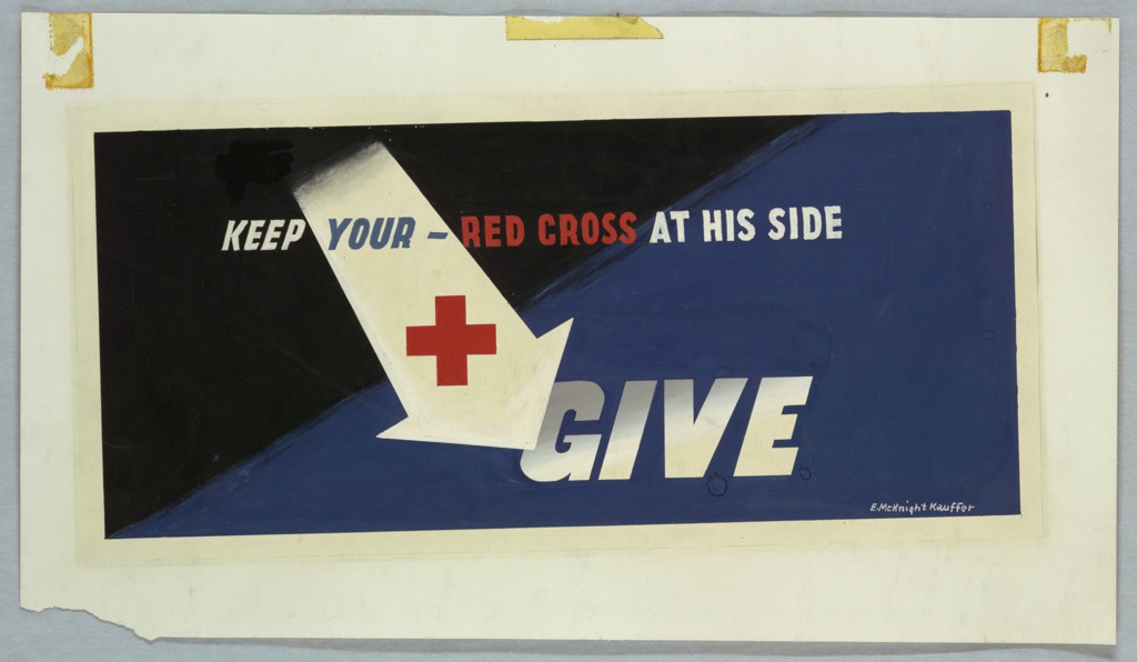 This is a Drawing. It was designed by E. McKnight Kauffer and made for (as the client) American Red Cross. It is dated 1944 and we acquired it in 1963. Its medium is brush and gouache with graphite. It is a part of the Drawings, Prints, and Graphic Design department.