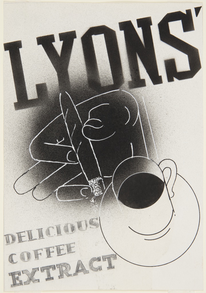 Drawing, Design for an Advertisement, Lyons' Delicious Coffee Extract; Designed by Edward McKnight Kauffer (American, active England, 1890–1954); Client: Lyons; USA; graphite, airbrush and black watercolor, brush and black and white gouache on paper; 24.6 × 17.1 cm (9 11/16 × 6 3/4 in.); Gift of Mrs. E. McKnight Kauffer; 1963-39-694