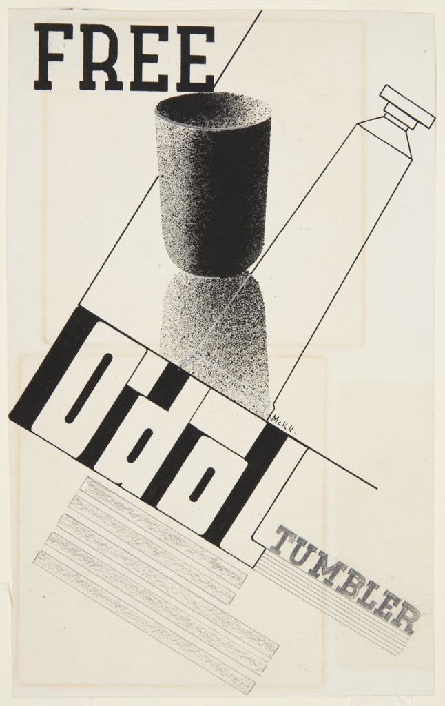 Drawing, Free Odol Tumbler; Designed by Edward McKnight Kauffer (American, active England, 1890–1954); Client: Odol Mouth Wash and Tooth Paste; USA; graphite, brush and black gouache on paper; 26.5 × 16.2 cm (10 7/16 × 6 3/8 in.); Gift of Mrs. E. McKnight Kauffer; 1963-39-701