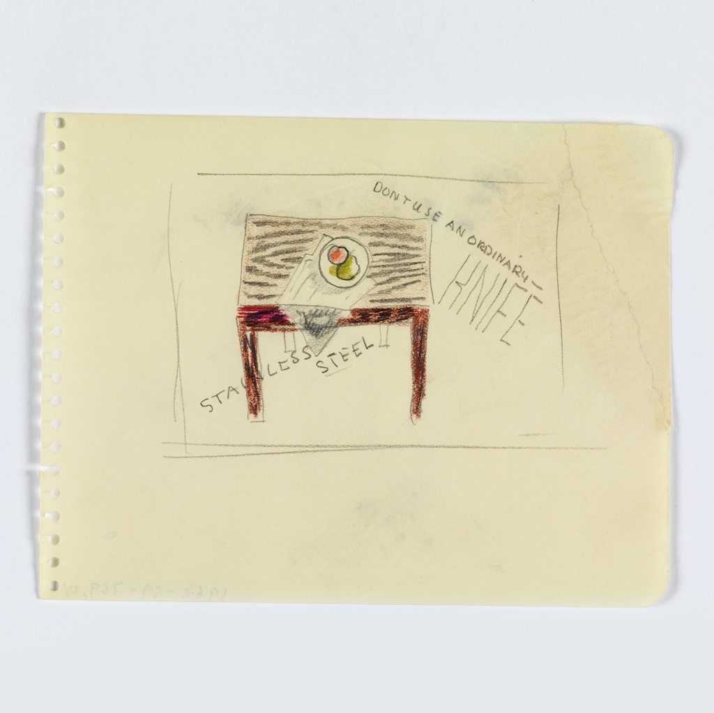 Drawing, Study for an Advertisement, Stainless Steel Knife; Designed by Edward McKnight Kauffer (American, active England, 1890–1954); USA; graphite, crayon on notebook paper; 10.5 × 13.5 cm (4 1/8 × 5 5/16 in.); Gift of Mrs. E. McKnight Kauffer; 1963-39-739