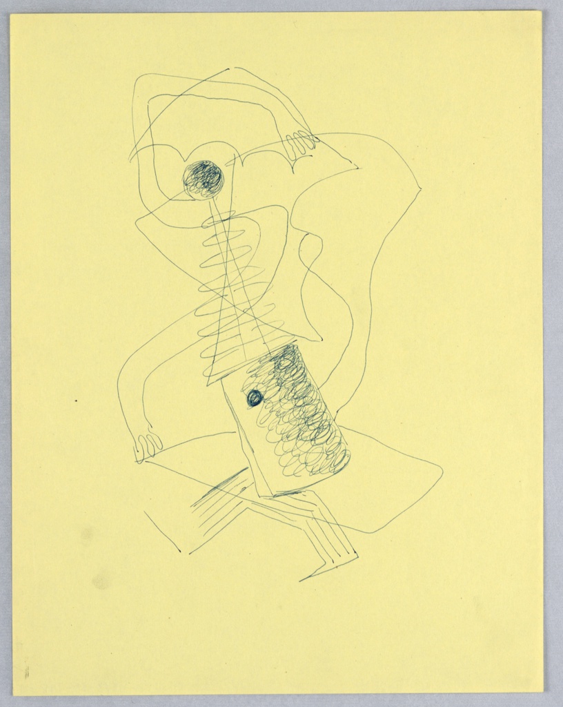 Drawing, Study of an Abstract Figure; Designed by Edward McKnight Kauffer (American, active England, 1890–1954); USA; pen and black ink on yellow paper; 27.8 × 21.7 cm (10 15/16 × 8 9/16 in.); Gift of Mrs. E. McKnight Kauffer; 1963-39-748