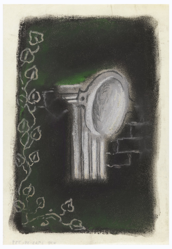 Drawing, Study for an Abstract Composition with Fluted Column; Designed by Edward McKnight Kauffer (American, active England, 1890–1954); USA; black, white, and green pastel on thin paper; 22.6 × 15.7 cm (8 7/8 × 6 3/16 in.); Gift of Mrs. E. McKnight Kauffer; 1963-39-779