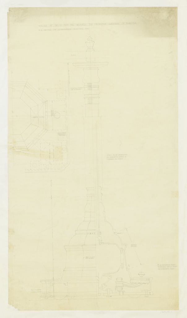 Inscribed in graphite, upper center: HOUSE AT DELHI FOR HIS HIGHNESS THE MAHARAJA, GAEKWAR OF BARODA. / F. S. DETAIL OF STANDARD ELECTRIC FAN.; center: SHAFT TO BE PACKED OUT / TO SILHOUETTE SHOWN & / COVERED IN FABRIC.