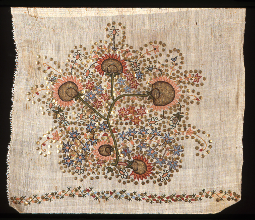 This is a Textile. It is dated 19th century and we acquired it in 1964. Its medium is silk embroidery with metal on linen foundation and its technique is embroidered on plain weave. It is a part of the Textiles department.