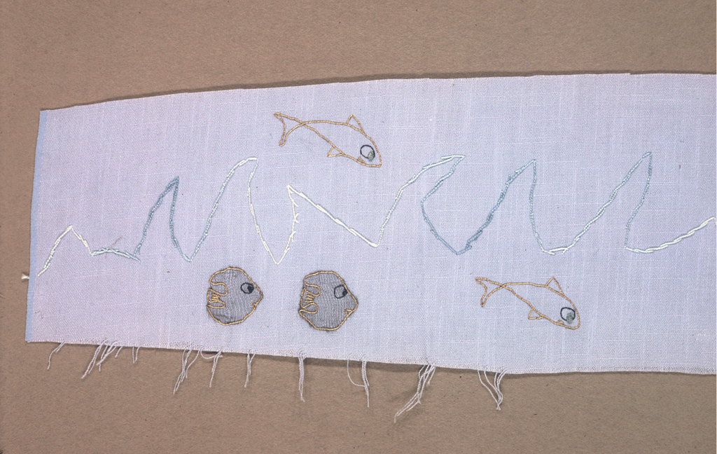 This is a Fragment. It was student of Mariska Karasz. It is dated 1950–60 and we acquired it in 1964. Its medium is cotton, metallic thread, rayon and its technique is embroidered. It is a part of the Textiles department.