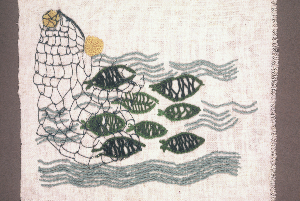 This is a Square. It was student of Mariska Karasz. It is dated 1950–60 and we acquired it in 1964. Its medium is cotton, metallic thread and its technique is embroidered. It is a part of the Textiles department.