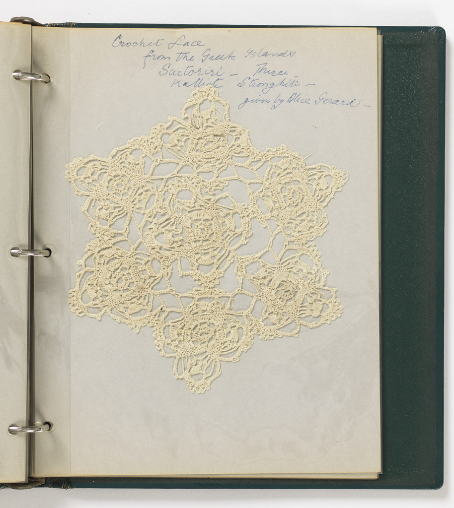 This is a notebook of lace samples. It was collected by Mrs. Marian Powys-Grey. It is dated 20th century and we acquired it in 1966. Its medium is leather, paper, linen, silk and its technique is notebook of needle and bobbin lace. It is a part of the Textiles department.