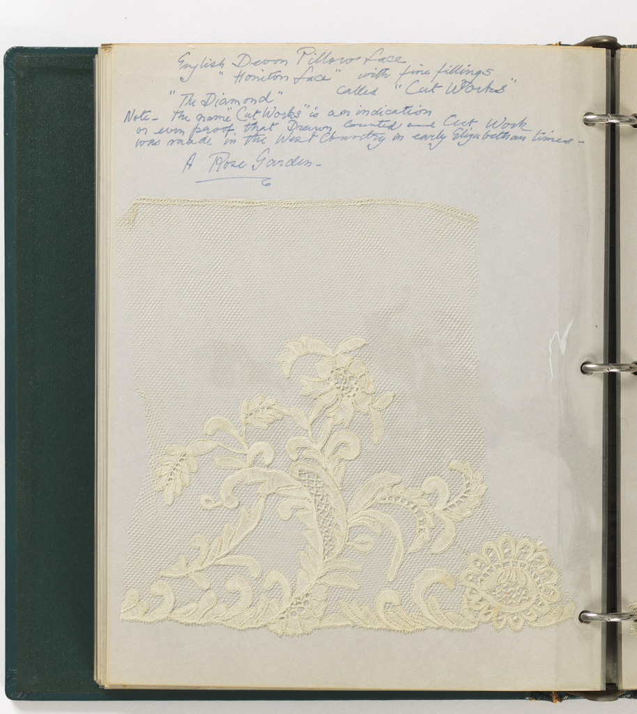 This is a notebook of lace samples. It was collected by Mrs. Marian Powys-Grey. It is dated 20th century and we acquired it in 1966. Its medium is leather, paper, linen, silk and its technique is notebook of needle and bobbin lace. It is a part of the Textiles department.