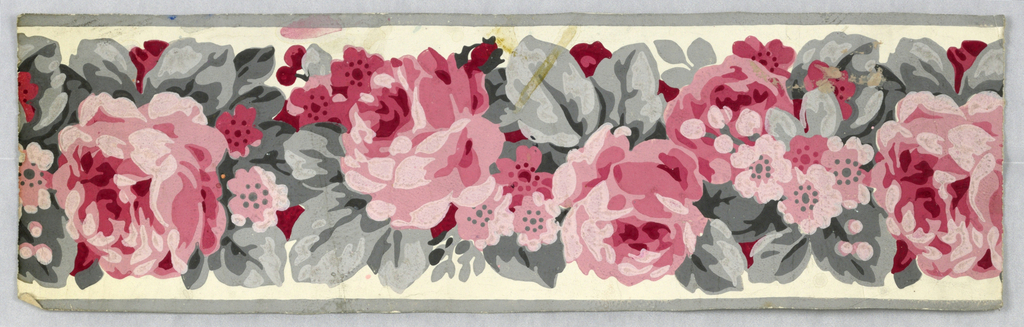 This is a Borders. It is dated 1900–1924 and we acquired it in 1966. Its medium is block-printed, stenciled, embossed paper, grasscloth. It is a part of the Wallcoverings department.
