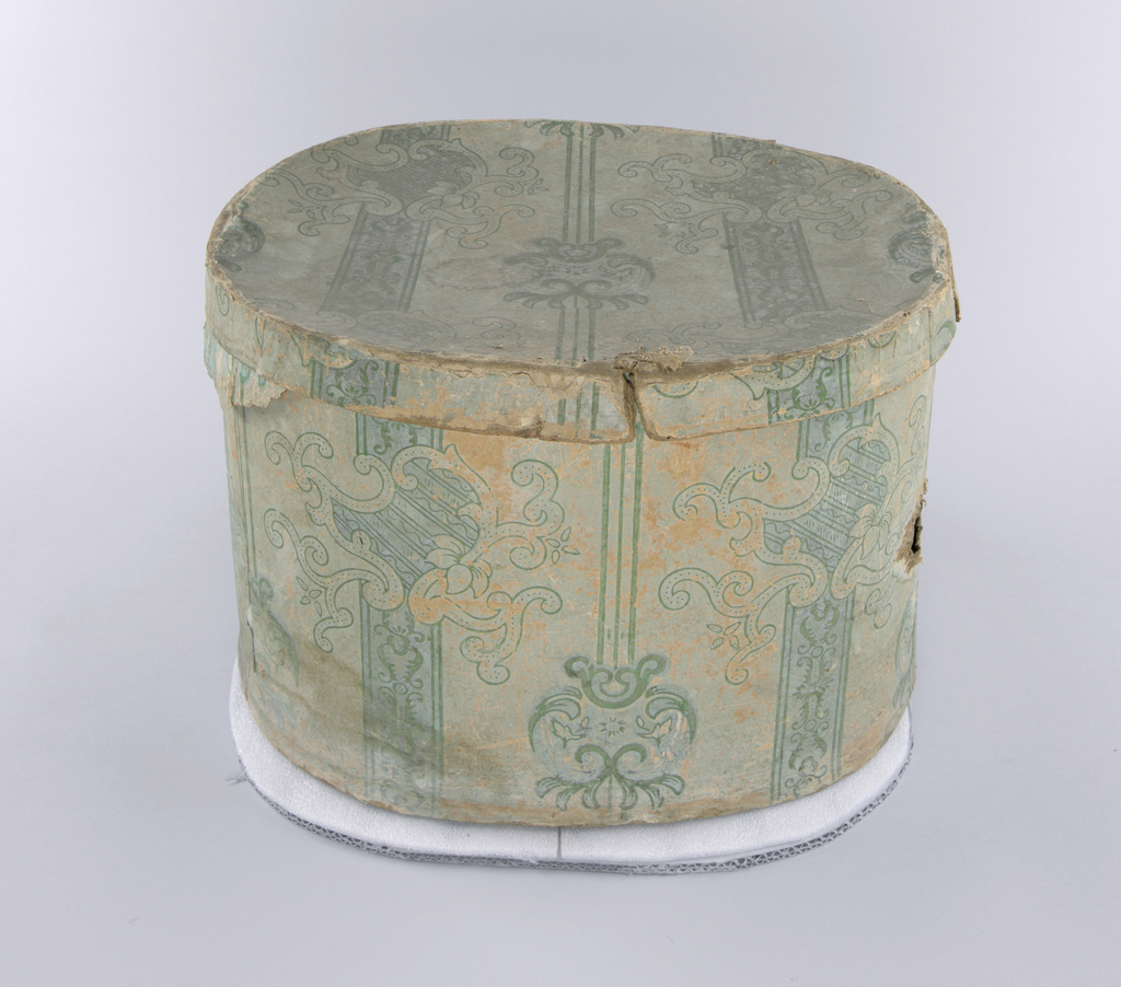 Bandbox (USA); machine-printed paper, pasteboard support, sized cotton; 43 x 34.5 x 29 cm (16 15/16 x 13 9/16 x 11 7/16 in.); Gift of Miss Joanne Burke; 1966-77-1-a,b