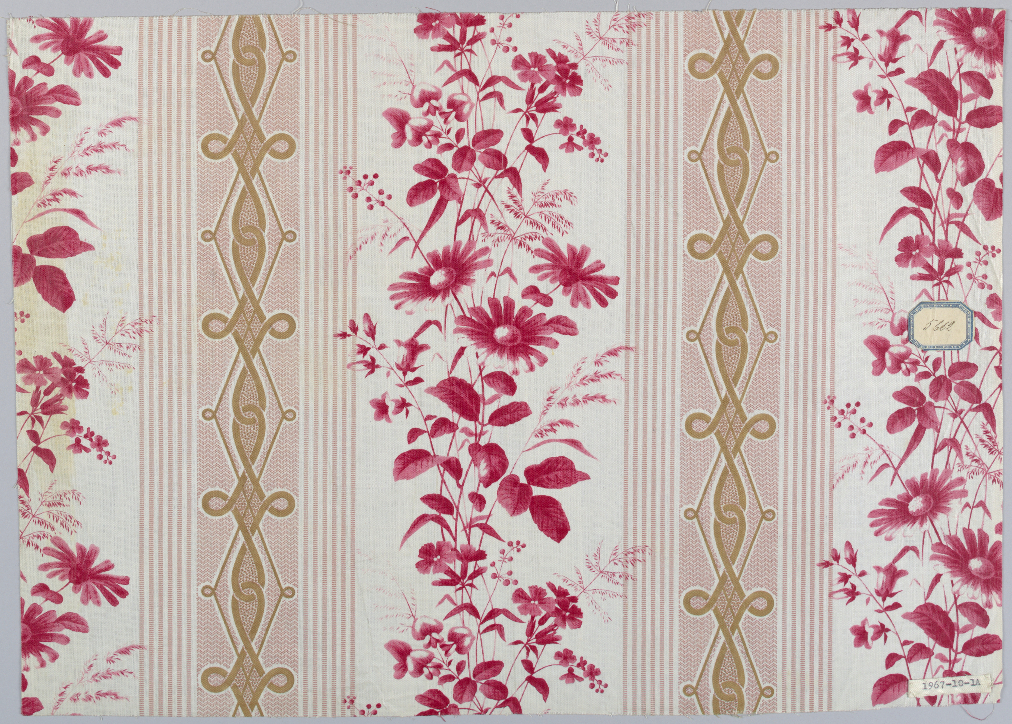 This is a Textile. It was manufactured by Schwartz-Huguenin. It is dated 1851–63 and we acquired it in 1967. Its medium is cotton and its technique is printed by engraved roller and/or block printed on plain weave; glazed. It is a part of the Textiles department.