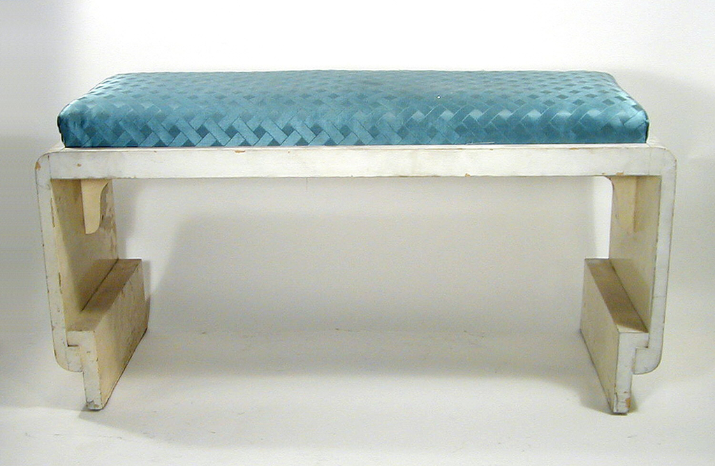 This is a Bench. It was designed by Hammond Kroll. It is dated ca. 1935 and we acquired it in 1967. Its medium is painted wood, cotton, synthetic. It is a part of the Product Design and Decorative Arts department.