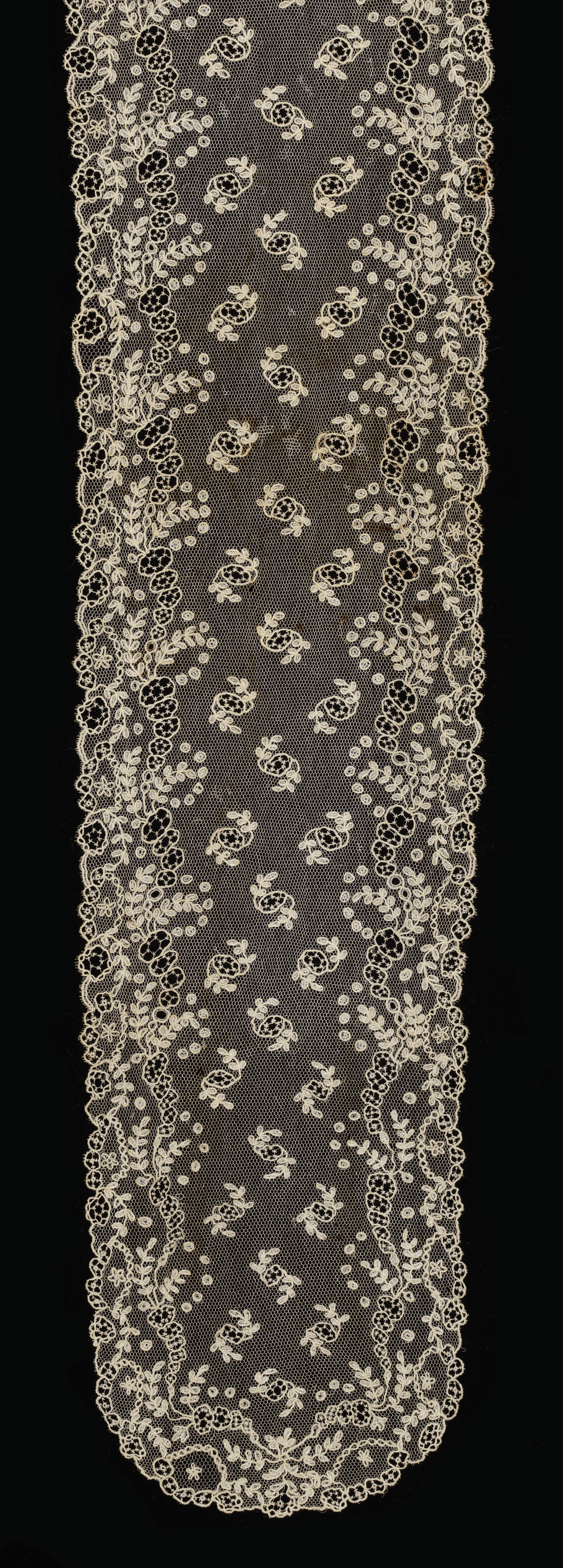 This is a Cap streamer. It is dated late 18th century and we acquired it in 1967. Its medium is linen and its technique is needle lace with bobbin-lace ground. It is a part of the Textiles department.