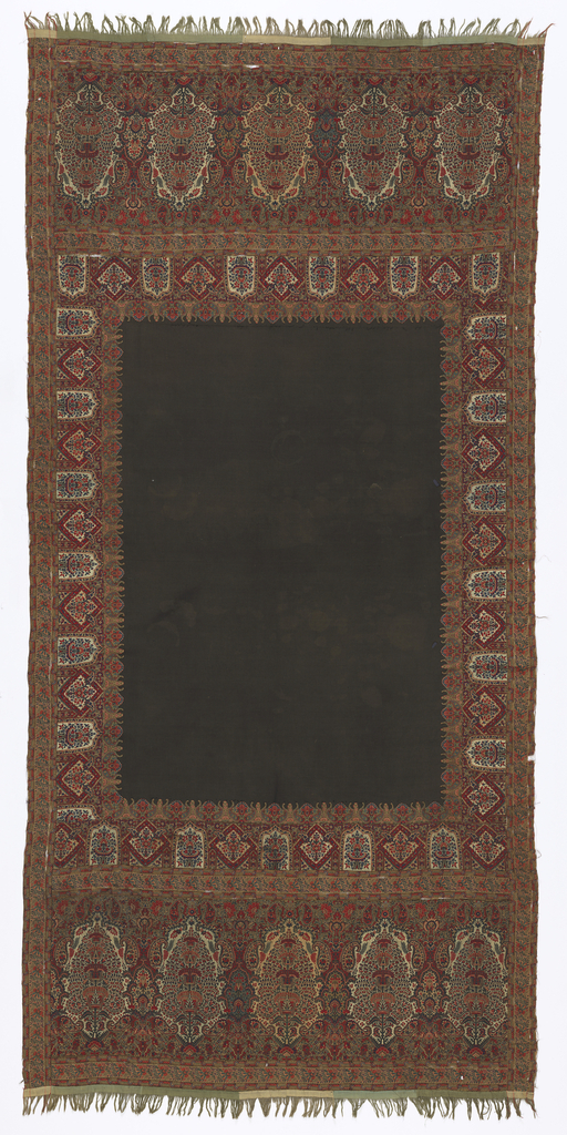 This is a Shawl. It is dated mid-19th century and we acquired it in 1967. Its medium is wool, silk and its technique is black center and fringe: 2/2 twill panels and borders: complementary weft, patterned 3/1 twill. It is a part of the Textiles department.