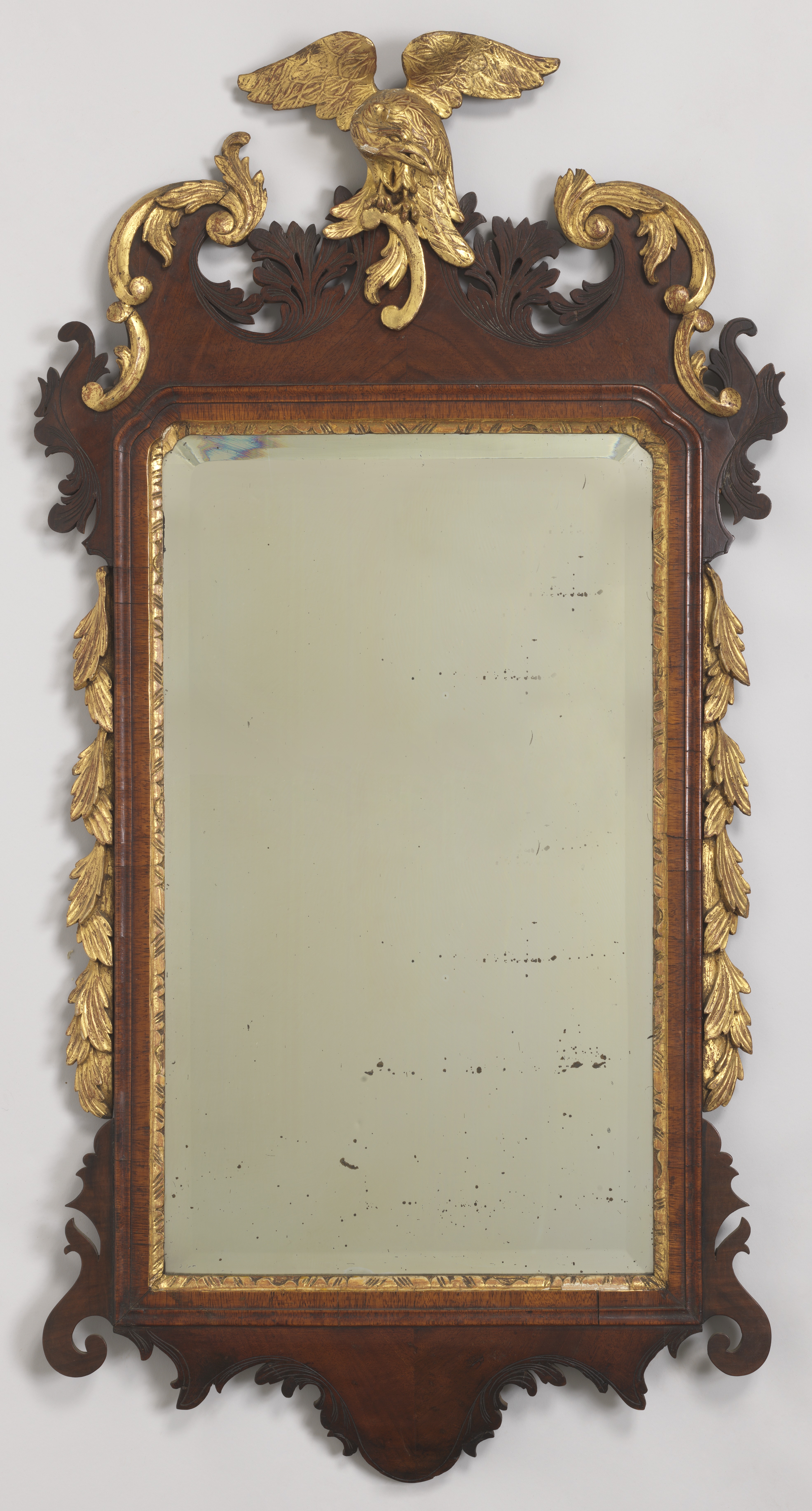 This is a mirror. It is dated ca. 1755 and we acquired it in 1967. Its medium is carved mahogany and mahogany veneered carved gessoed and gilt pine, silvered glass.. It is a part of the Product Design and Decorative Arts department.