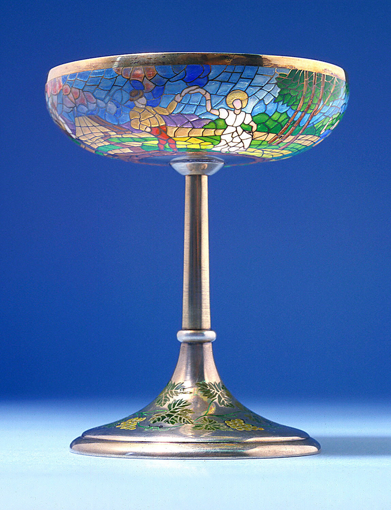 This is a Wine glass. It is dated 1915–30 and we acquired it in 1968. Its medium is plique a jour enamel, various metals. It is a part of the Product Design and Decorative Arts department.