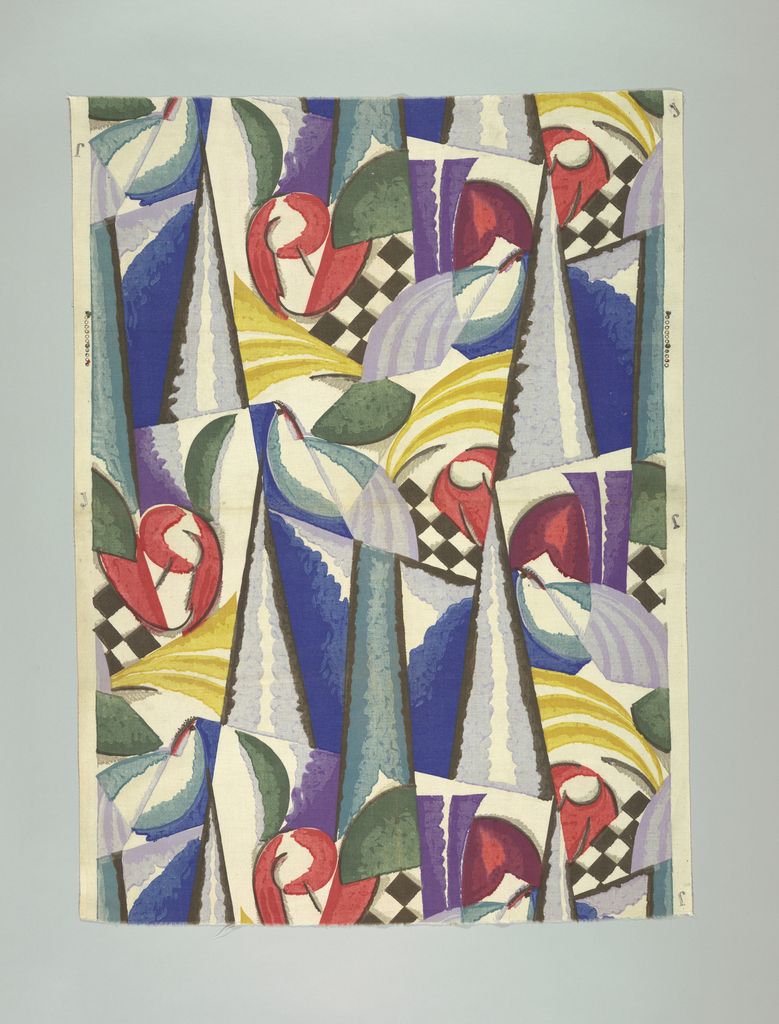 The pattern of this textile, which incorporates influences from Léger to the Wiener Werkstätte, was also used for wallpaper on view at the 1925 Paris Exposition. The textile and wallcoverings manufacturer Paul Dumas also produced work for Paul Poiret’s decorating workshop Atelier Martine.
