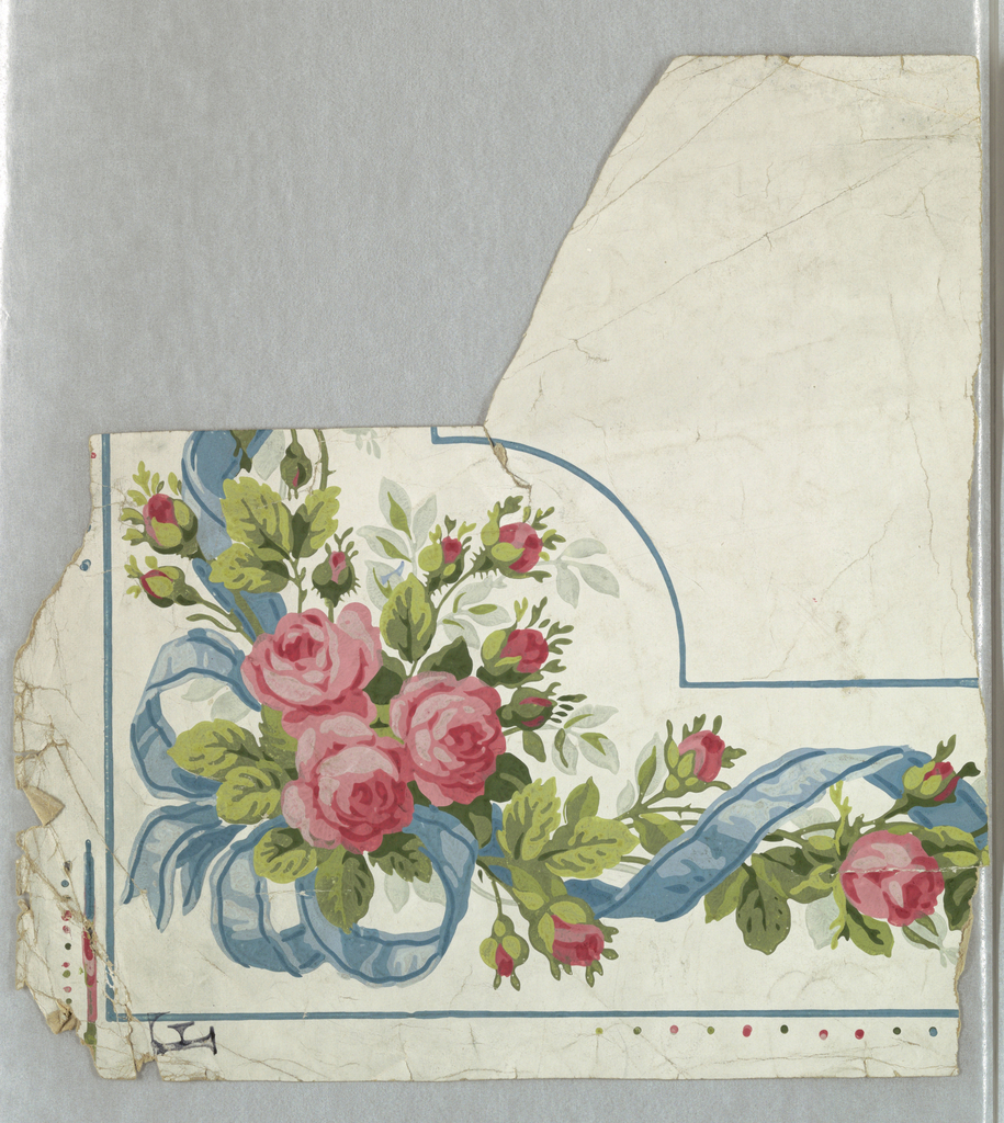 This is a Border - corner. It is dated 1900–25 and we acquired it in 1968. Its medium is block-printed. It is a part of the Wallcoverings department.