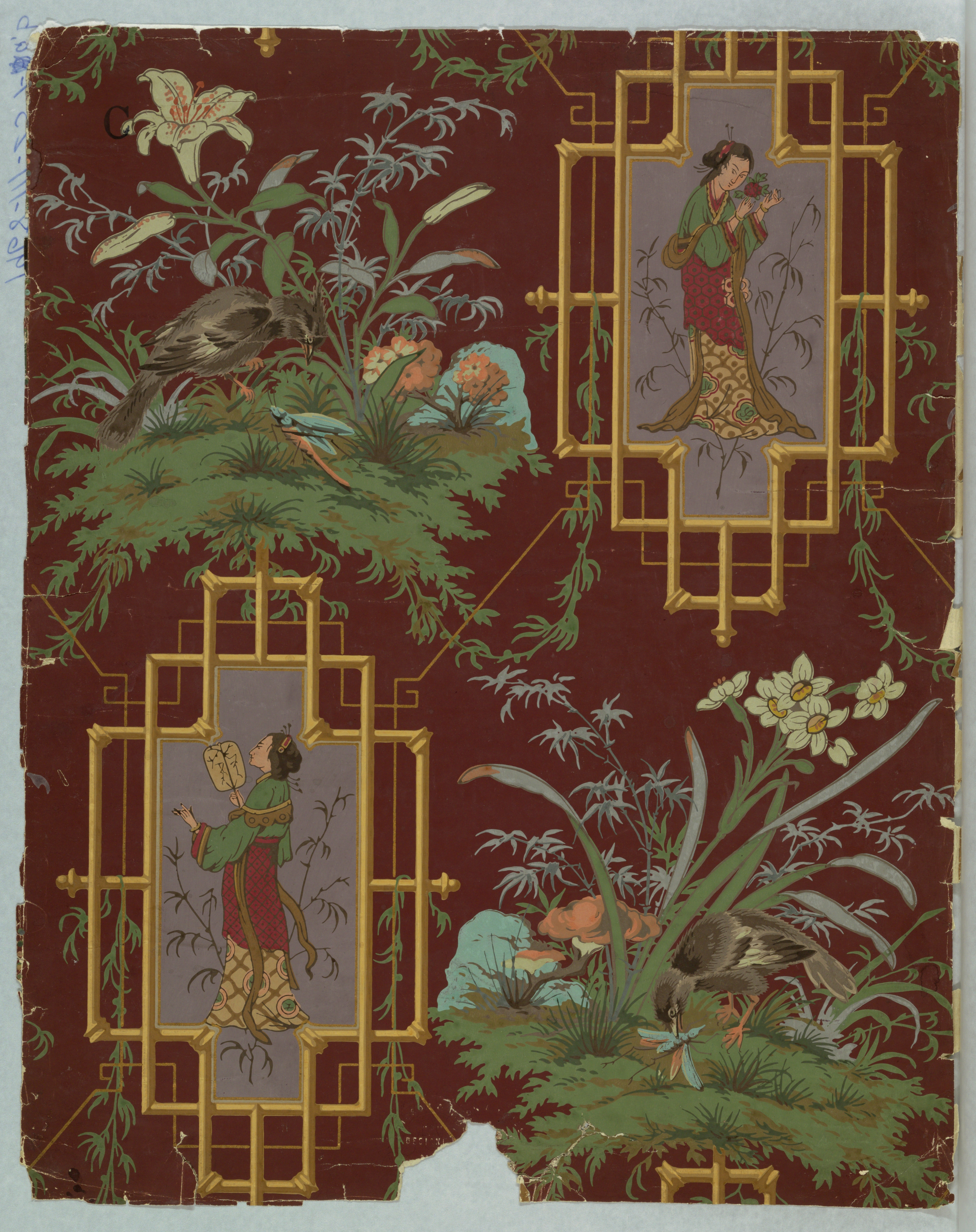 Images of bamboo appeared on Chinese export wallpapers in the seventeenth century which inspired Western manufacturers to use bamboo motifs to instill an Asian aesthetic in their designs. This design pushes the Japanese aesthetic with bamboo medallions enframing a female figure clothed in a traditional Japanese kimono. The medallions alternate with landscape views containing a bird and cricket.