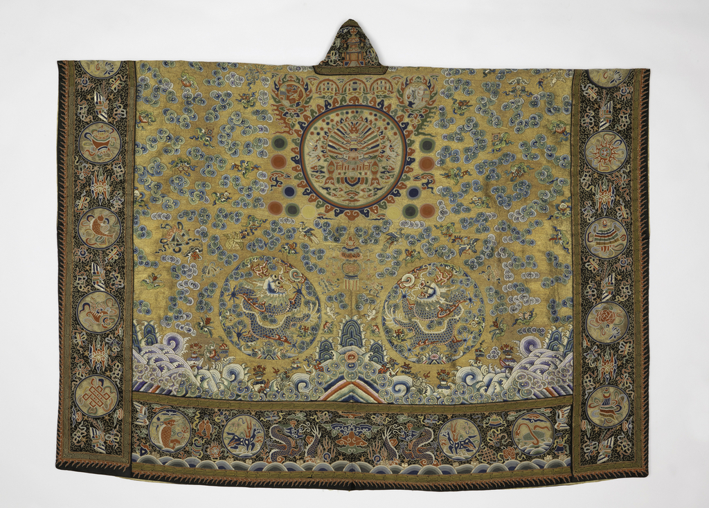 The visual complexity of the "robe of descent" (jiang yi絳衣) worn by the highest-ranking Daoist priests demonstrates how priests used symbols and words to control their environment. The complex symbols were believed to transform the wearer into a ritual participant who communicated between human and spirit worlds. The priest faced the altar to conduct rites, so the robe back typically contains the design’s focal point: Above a central pagoda surrounded by twenty-eight Lunar Mansions (the colored discs), are three small circles representing gates and on either side, roundels containing symbols for sun (represented as a three-legged pheasant) and moon (represented as a rabbit pounding a mortar). This robe features large roundels with five-clawed dragons chasing magic pearls: four on the front and two on the back, surrounded by bats, swastikas, and cranes. The robe’s bottom bands have dragons rising out of the sea, medallions containing carps, turtles, snake, qilins, and other auspicious symbols. Smaller roundels around the side borders contain the Eight Auspicious Buddhist symbols, and Taoist immortal symbols. The robe fastens with two yellow silk tabbed ribbons embroidered with Sanskrit writing. Religious garments often feature heavy use of metallic threads, here the ground is laid down with gold couched threads that set off the embroidered clouds and bats, and thicker gold strips are laid down around the borders.