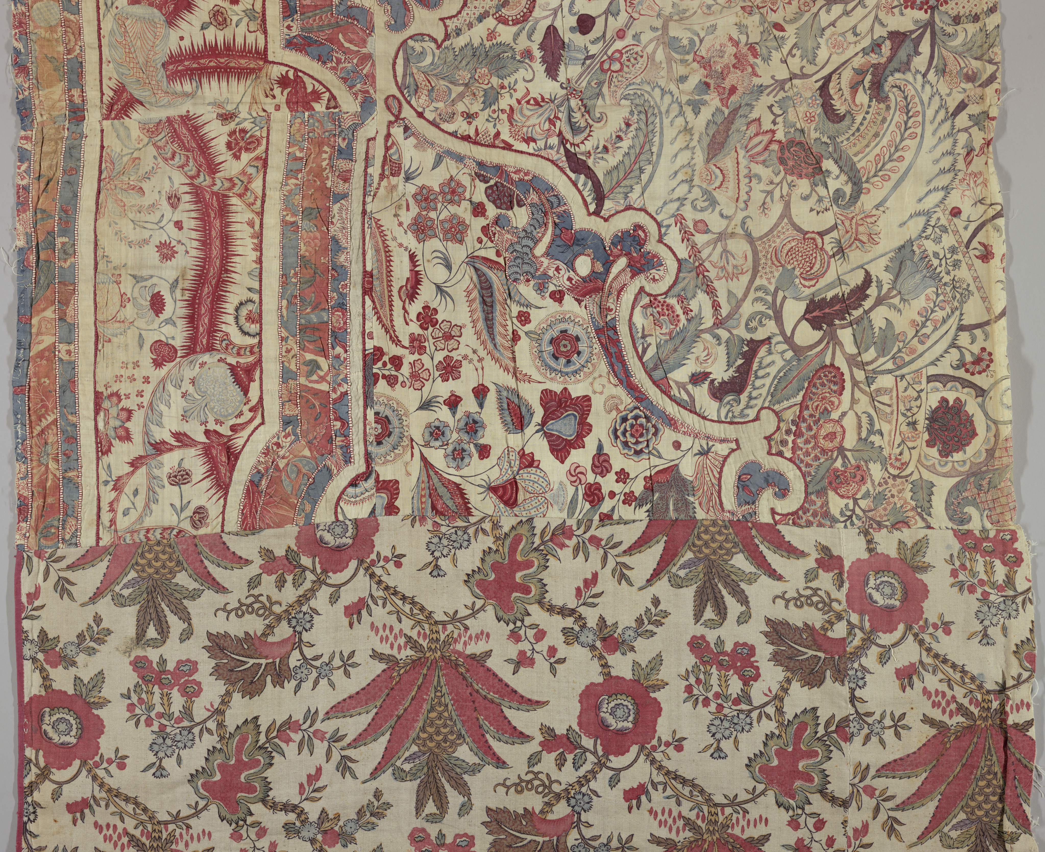 This is a Curtains. It is dated 1725–50 and we acquired it in 1968. Its medium is cotton, linen and its technique is patchwork of different plain weave fabrics which have been mordant and resist painted and dyed. It is a part of the Textiles department.