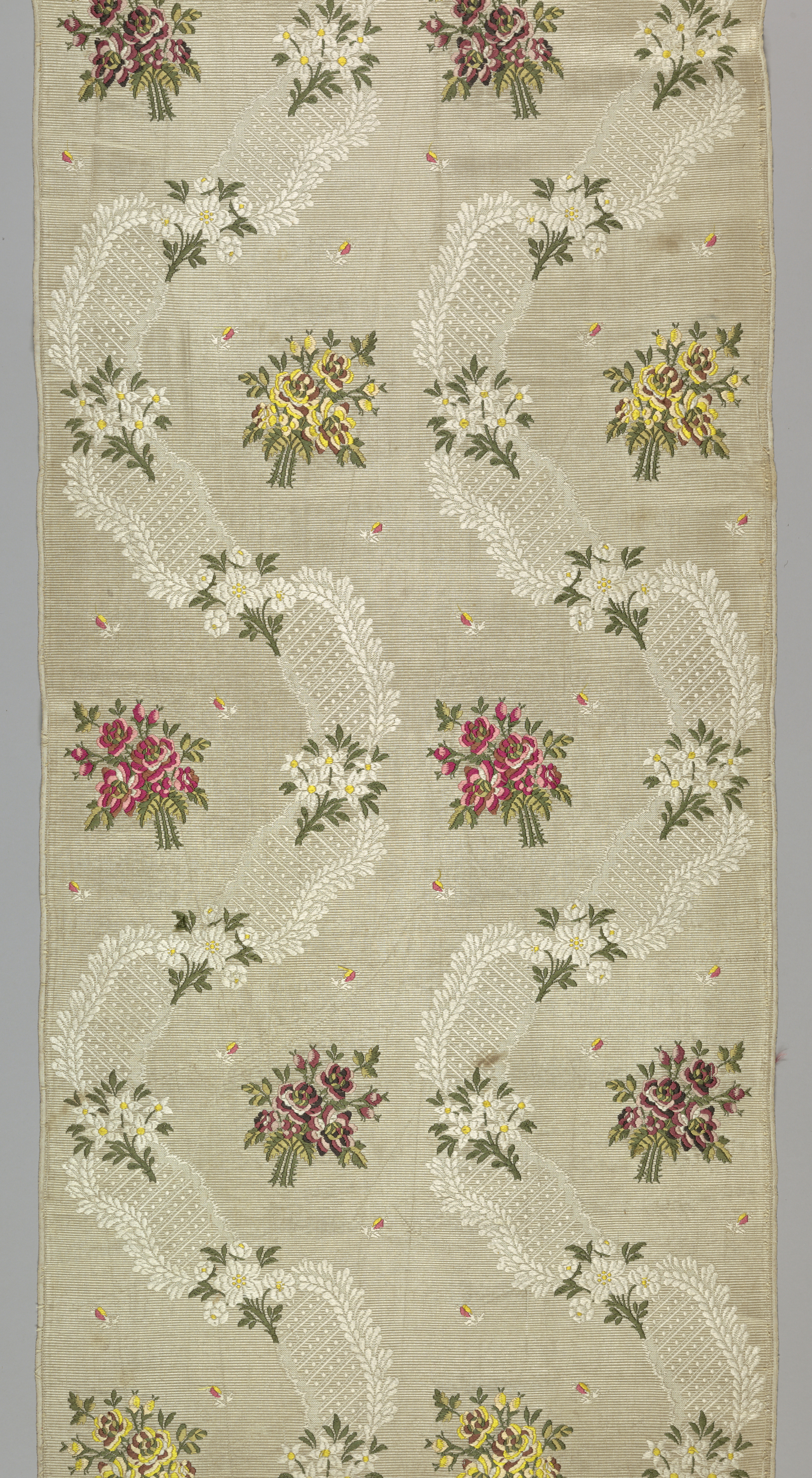 This is a Textile. It is dated early 19th century and we acquired it in 1968. Its medium is silk and its technique is warp-faced plain weave with supplementary warp floats (background) and supplementary weft. It is a part of the Textiles department.