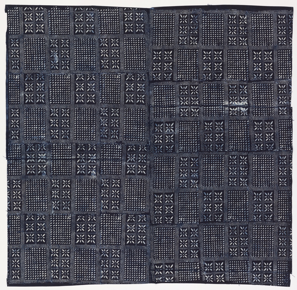 This is a Wrapper. It is dated mid- 20th century and we acquired it in 1969. Its medium is cotton and its technique is factory-woven plain weave, stencil-applied cassava paste resist, indigo dyed. It is a part of the Textiles department.
