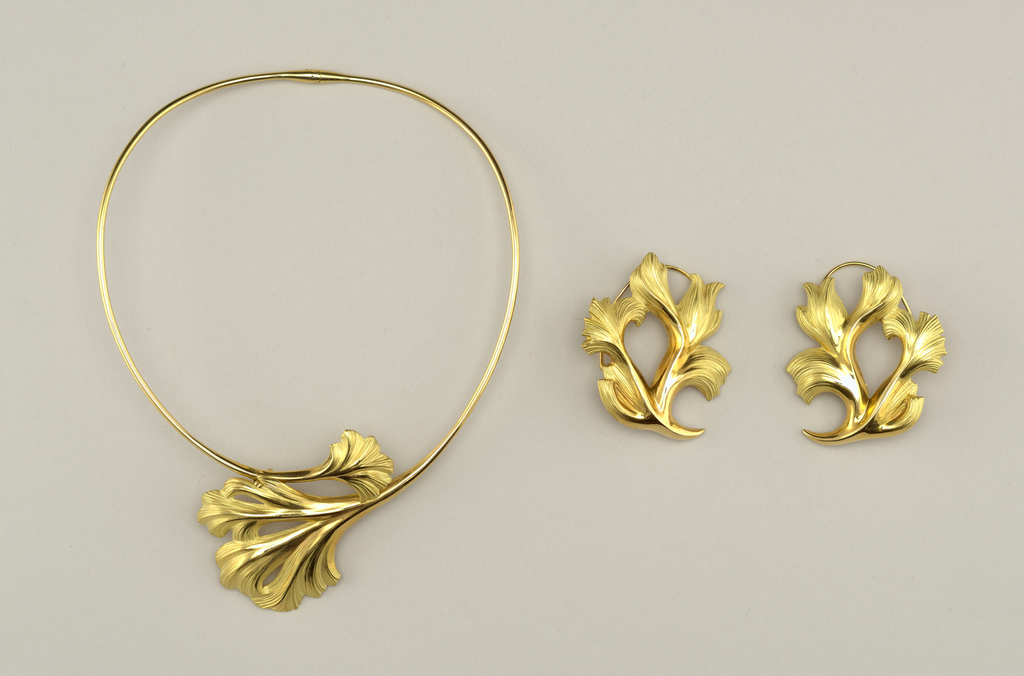 H x W x D (necklace): 17.3 x 13 x 3 cm (6 13/16 x 5 1/8 x 1 3/16 in.) H x W x D (earrings): 5.5 x 5.2 x 2 cm (2 3/16 x 2 1/16 x 13/16 in.)