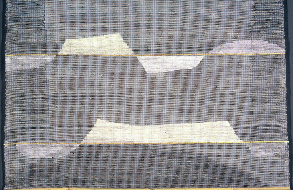 This is a Hanging. It was designed by Theo Moorman. It is dated 1969 and we acquired it in 1969. Its medium is linen, straw, bamboo and its technique is plain weave with discontinuous supplementary weft (brocade) bound by a supplementary warp in plain weave. It is a part of the Textiles department.