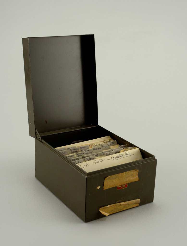 This is a Card file. We acquired it in 1969. Its medium is metal. It is a part of the Textiles department.
