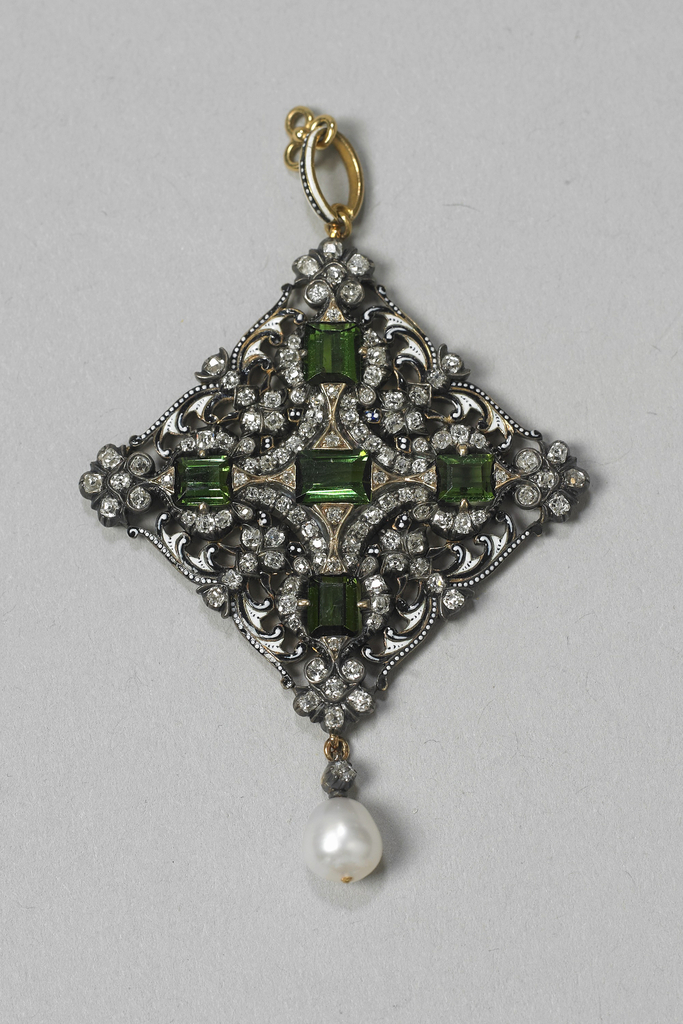 This is a necklace. It was made by Carlo Giuliano. It is dated ca. 1890 and we acquired it in 1969. Its medium is gold, enamel, diamonds, pearls, peridots. It is a part of the Product Design and Decorative Arts department.