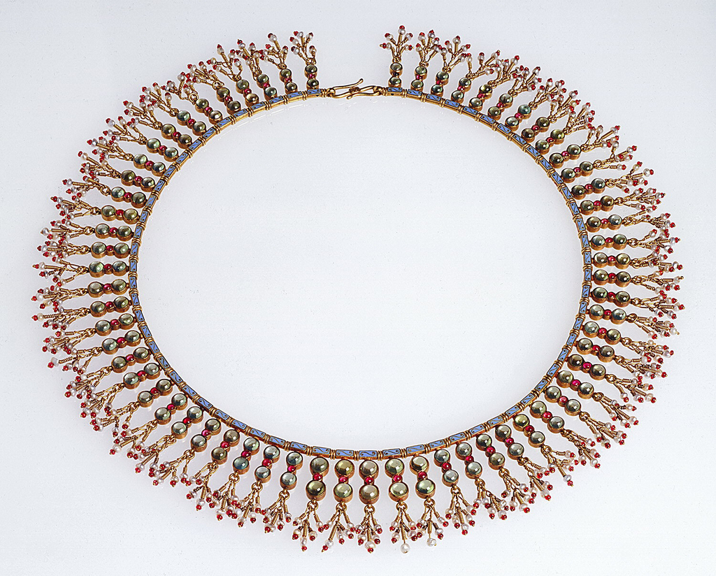 Necklace (England); Made by Carlo Giuliano (Italian, 1831 - 1895); gold, enamel, catseyes,rubies, pearls; H x W: 39 x 3 cm (15 3/8 x 1 3/16 in.); Museum purchase through gift of Anonymous Donor, Annie Schermerhorn Kane, and various donors; 1969-40-133