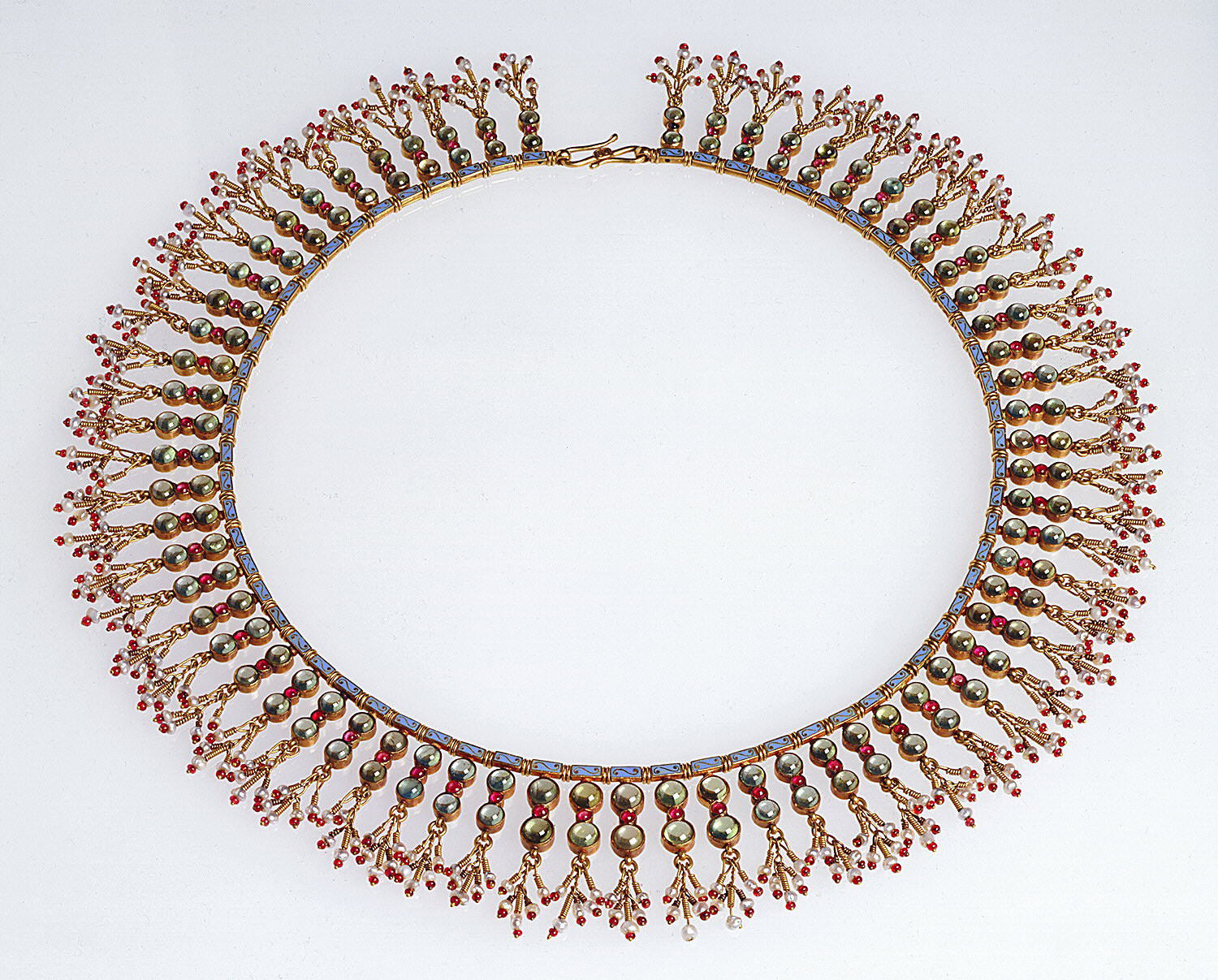This is a necklace. It was made by Carlo Giuliano. It is dated 1863–96 and we acquired it in 1969. Its medium is gold, enamel, catseyes,rubies, pearls. It is a part of the Product Design and Decorative Arts department.