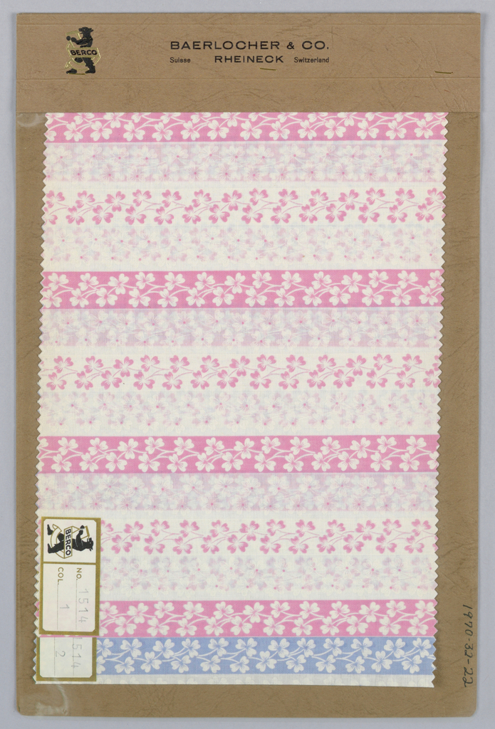 This is a Samples. It was manufactured by Baerlocher & Company. We acquired it in 1970. Its medium is printed. It is a part of the Textiles department.