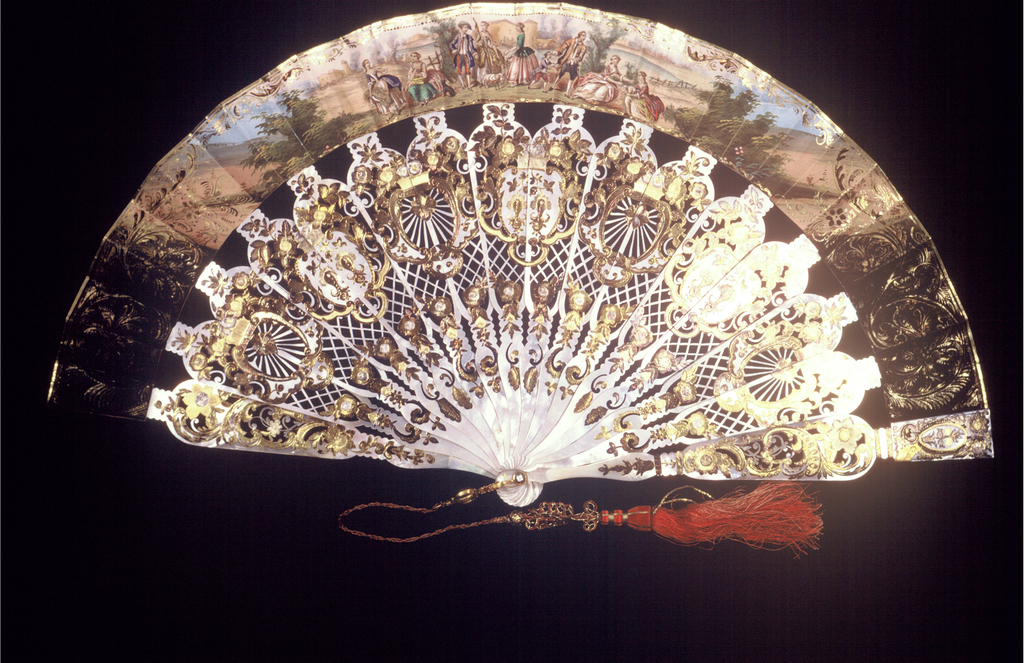 This is a Pleated fan. It is dated 19th century and we acquired it in 1970. Its medium is printed and hand-colored paper leaf, painted parchment leaf, pierced and gilded mother-of-pearl sticks, rivet set with faceted stone, gilt metal bail, tassel of silk and metal threads. It is a part of the Textiles department.