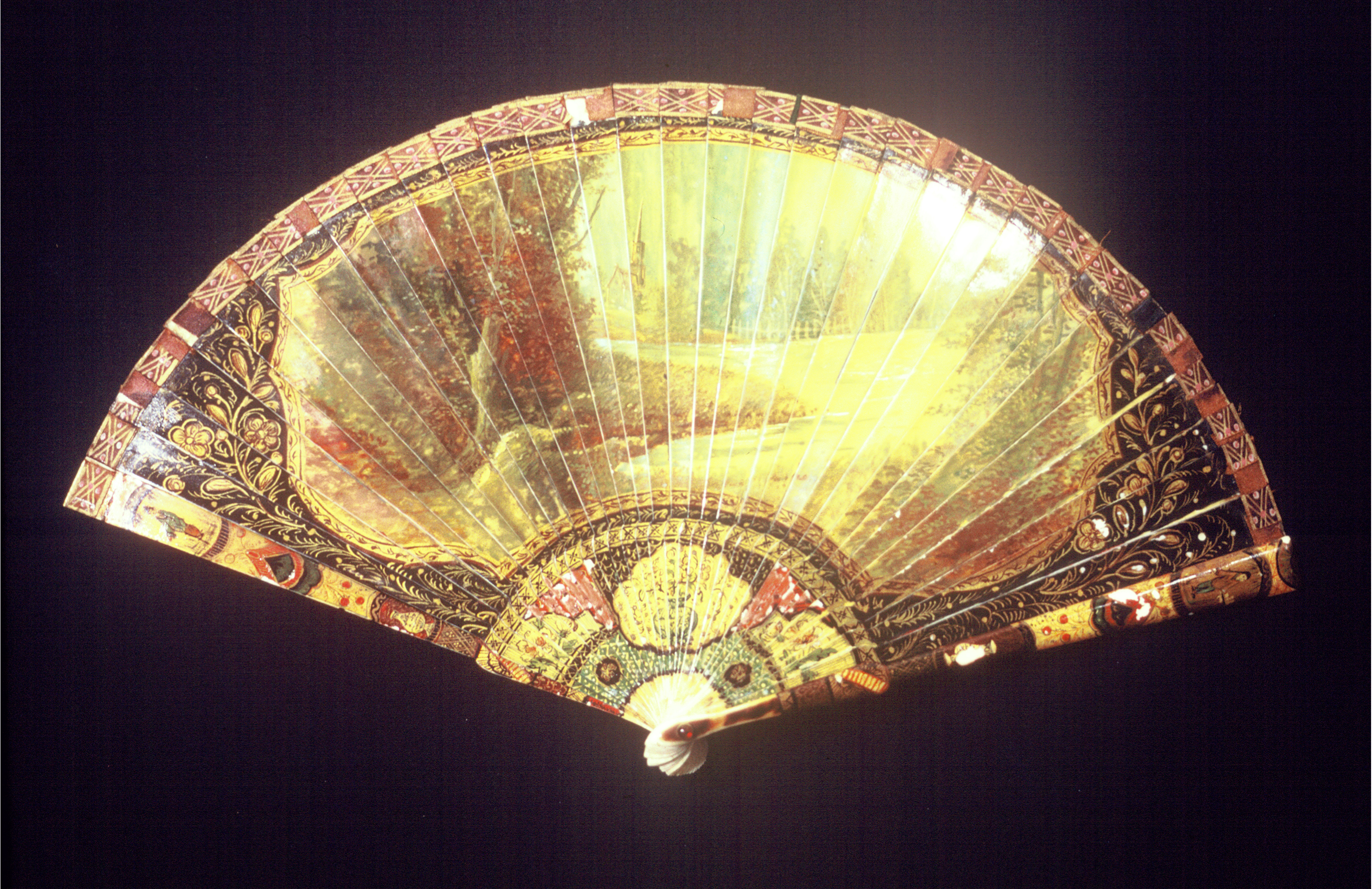 This is a Brisé fan. It is dated late 19th century and we acquired it in 1970. Its medium is painted bone sticks, silk ribbon, rivet set with a stone. It is a part of the Textiles department.