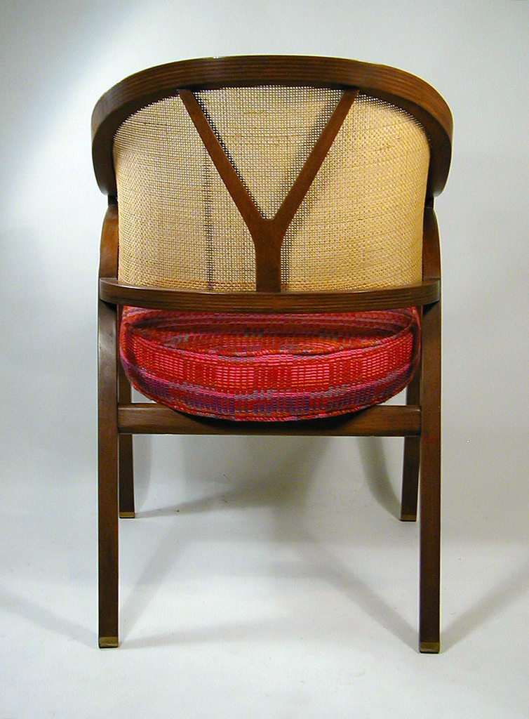 Caning in furniture is a method of weaving peeled rattan vine to form chair seats or backs. The technique first became popular in Europe in the mid-seventeenth century and has enjoyed continued use to the present. Wormley often employed caning in his chair backs in the 1940s and 50s; in this chair the caning allows one to see the Y-shaped back support from the front.