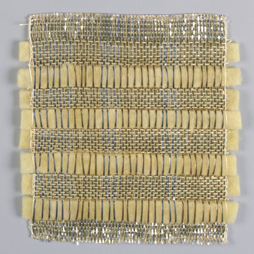 This is a Sample. It was designed by Mary Walker Phillips and student at Cranbrook Academy of Art and woven by Mary Walker Phillips. It is dated 1960–63 and we acquired it in 1971. Its medium is lurex® (cellulose acetate butyrate film laminated aluminum yarn), insulating glass, polyvinylidene chloride:methyl methacrylate), silk and its technique is two intercrossed plain weave structures (double cloth), each cloth a band of plain weave alternating with a single shot of insulating glass. two cloths held together by an inter-cross of the two layers and at the edges by the fiber weft. It is a part of the Textiles department.