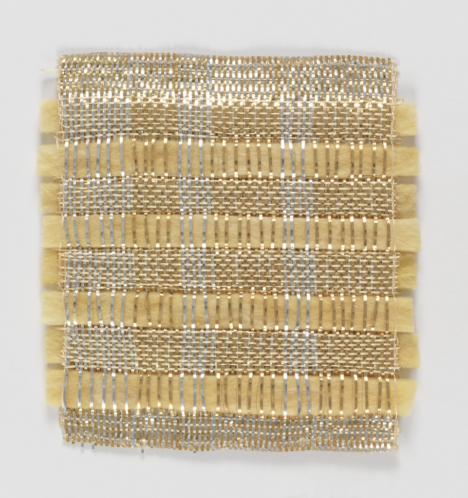Sample (USA); Designed by Mary Walker Phillips (American, 1923–2007); Student at Cranbrook Academy of Art; lurex® (cellulose acetate butyrate film laminated aluminum yarn), insulating glass, polyvinylidene chloride:methyl methacrylate), silk; Warp x Weft: 22.2 × 21 × 1 cm (8 3/4 × 8 1/4 × 3/8 in.); Gift of Mary Walker Phillips; 1971-43-7-d