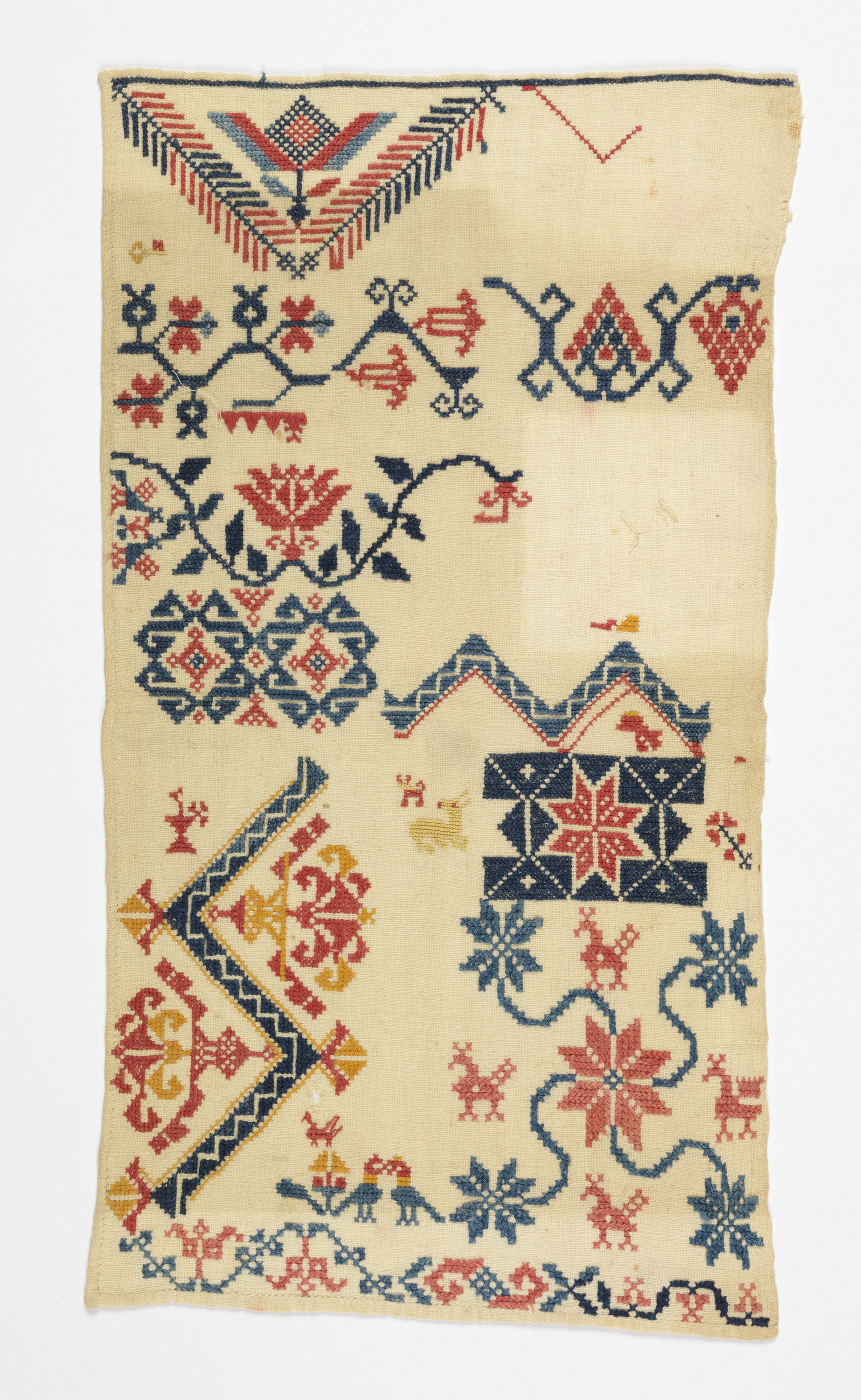 This is a Sampler. It is dated 19th century and we acquired it in 1971. Its medium is silk embroidery on linen foundation and its technique is embroidered in counted stitches on plain weave. It is a part of the Textiles department.