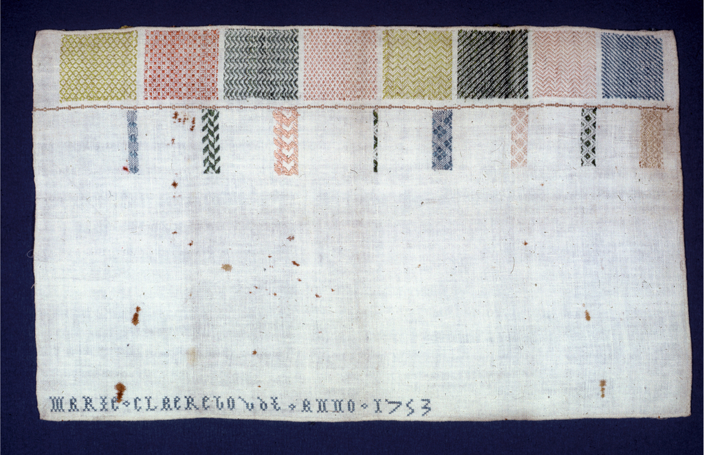 This is a Sampler. It was embroidered by Marie Claerejo. It is dated 1753 and we acquired it in 1971. Its medium is linen, silk and its technique is cross stitch. It is a part of the Textiles department.