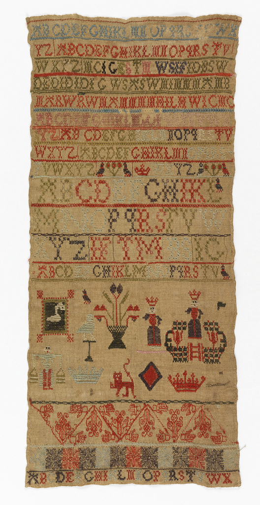 Sampler (England); wool on linen; H x W: 43.8 x 20.3 cm (17 1/4 x 8 in.); Bequest of Marian Hague; 1971-50-180