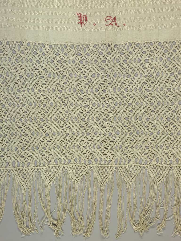 This is a Cover. We acquired it in 1971. Its medium is linen and its technique is knotting (macramé), plain weave. It is a part of the Textiles department.