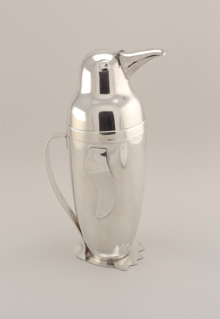 A humorous design, this penguin-shaped cocktail shaker was manufactured in 1936, two years after the release of The Thin Man, and captures two other traits of 1930s cocktail culture: novelty and pleasure. Standing a little over a foot tall, one can easily imagine this silver-plated shaker glistening with moisture from the cold beverage inside of it. In fact, the shaker’s purpose draws upon the penguin’s literal associations to both ice and cold, giving it a tongue-in-cheek quality. In the 1930s the Napier Company began to focus on its giftware line, which included barware. In the December 1936 issue of Vogue, their feature “Vogue’s 100 Gifts,” mentions a glass liquor set, ashtray, and a bartowel specifically designed for a cocktail shaker, as potential holiday gifts. Amusingly, the caption for the bartowel is “Help your friends pass their bar exams with this imported linen bartowel with its escape proof pocket for the cocktail shaker.”[1] Napier was right on the mark for creating barware for gift-giving.